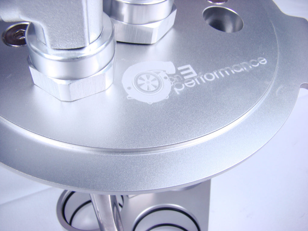 We were the first to offer a hat assembly for the Mustangs to allow multiple pumps to feed and have only one single feed line outlet. Our design starts with 4 solid billet 6061 chunk of aluminum and machined down to what you see here. This is where our setup is different from anything on the market currently. We designed the top portion as 2 pieces and machined the top so all fuel pumps would come out of 1 single port. Its more involved and labor intensive to do so but avoids any need for extra lines and Y-blocks. So you just have one simple line coming out of the hat to work forward no matter how many pumps you are running. Our fuel hat is designed to be ran with the 340 or 342 series pumps. A majority of our customers add a set of our On 3 Performance 320lph e-85 safe pumps to support about any power level. The 3rd pump really is not needed unless your over 1000hp or on e-85.