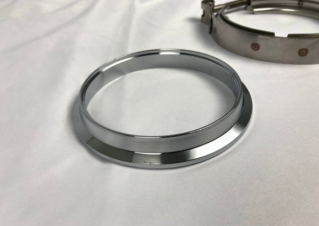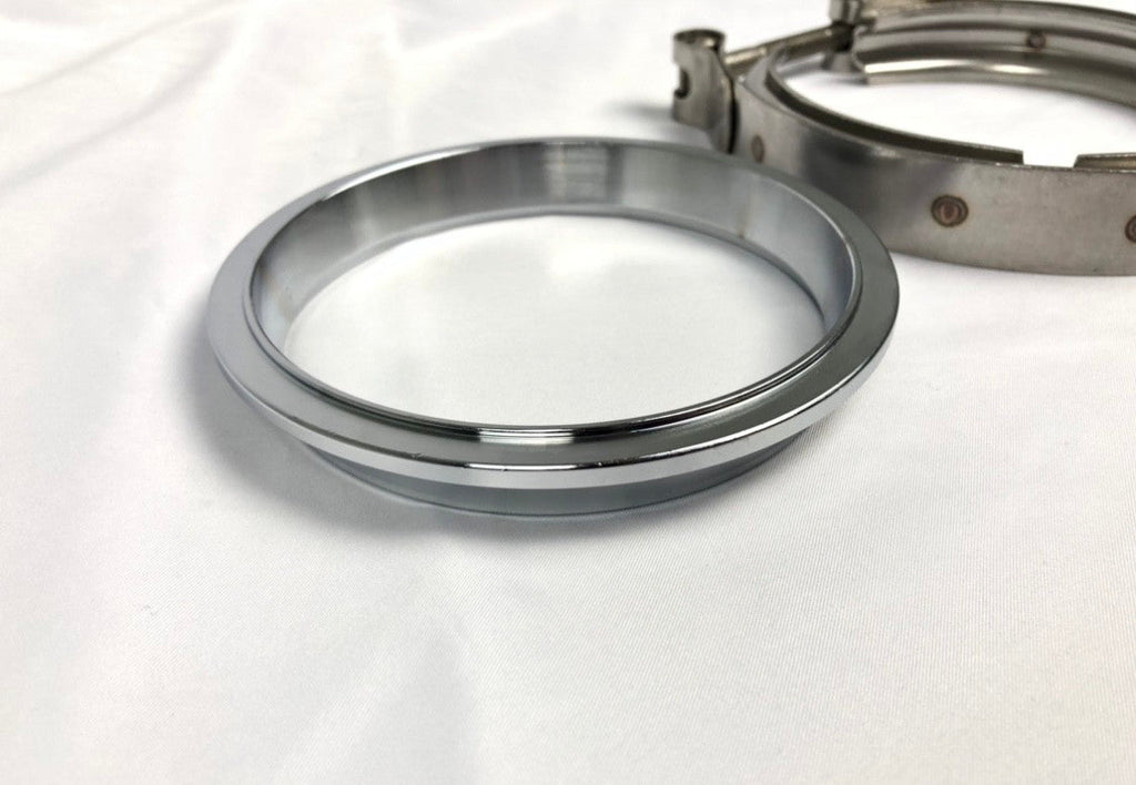 On 3 Performance 94mm / 107mm turbo exhaust housing outlet flange and clamp - Setup for 4.0" outlet downpipe. Clearly you can step it up from there but flange is machined to accept a 4" tube See photos for specs on ID/OD If you are buying the complete set of flanges.