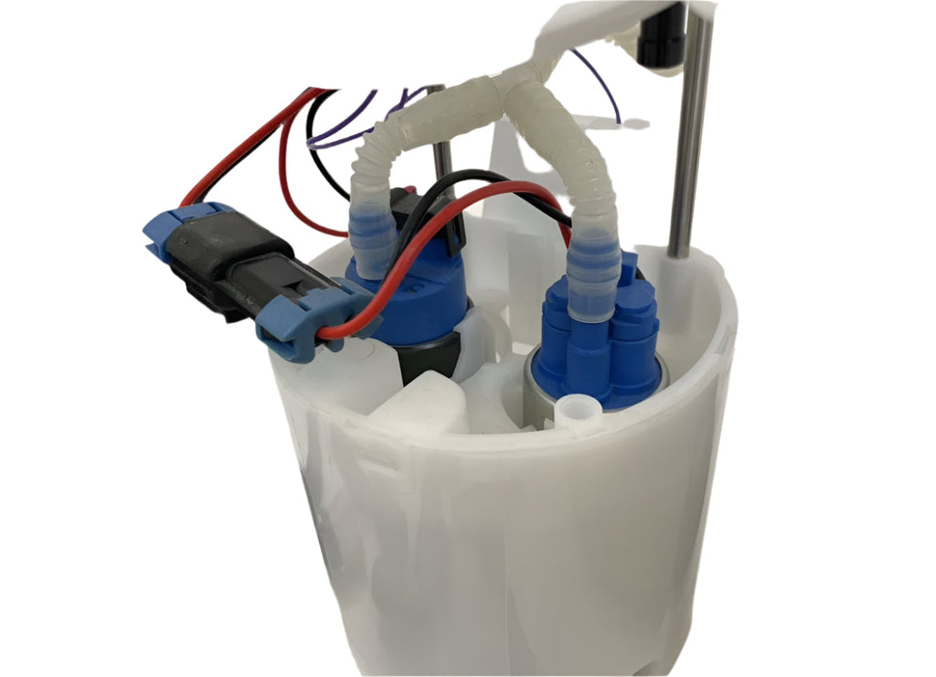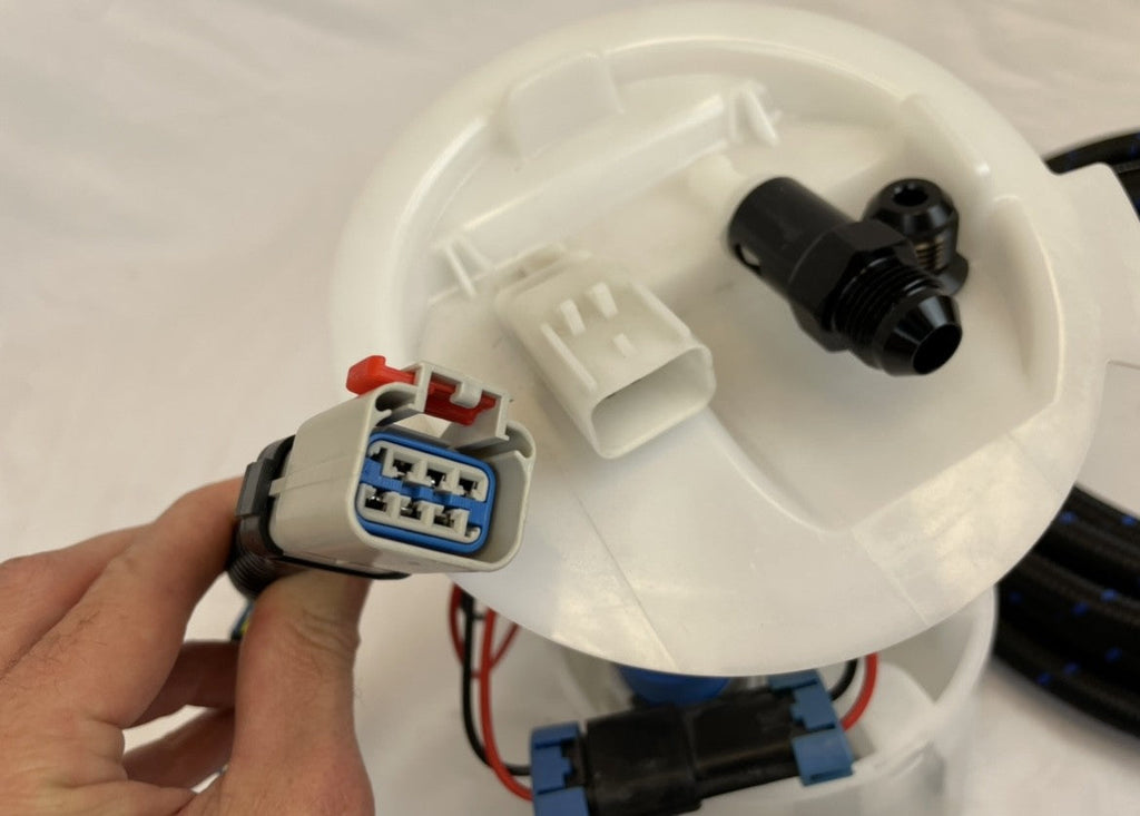 This is a game changer for the 2011+ Mustang platform when you want to make quick work of the fuel system. This is the most versatile system we have to offer and will accommodate nearly any power adder application out there and not to mention the easiest fuel system upgrade you can find. We have a completely brand new injection mold that is modeled to fit just like a factory. After looking a little closer, you will notice the twin pump in the housing. We tested with each of our pumps on the coyote platform to see what we could make on a single pump and then clearly with the twins. With a single On 3 525lph pump in our shop F-150 truck, we were able to put down right at 700 wheel on the single pump, very impressive. With that being said, we came up with an idea to help keep the fuel cool as possible for driving condition but also have the volume needed to keep up with the flow demands of e-85 over 700 wheel. So when it came down to the design, we had our engineer draw up the basket to house a 320lph pump to run full time and the 525lph pump to kick in with boost. There is virtually zero reason to run both pumps at all times when its only needed under boosted conditions. Many of these factory retro-fit kits use the older style modules that have a restriction at the feed. They have a smaller outlet which is setup for a 5/16 fuel line. Since we were going from scratch, we went ahead and increased that size to match the later model S550 applications which utilize a 3/8" outlet. So it might not seem like much but when you are wanting to get as close to say 1000hp, you need that added volume and capacity. Another feature we include with this is to retain a jet siphon pump system so the saddle tank will continue to fill the side with the fuel module. The fitting is CNC machined and factory in-tank line will snap into place Our module comes exactly as you see, pumps are installed, hoses connected, pigtails from the pump are already wired to the plug. This is a very simple upgrade that most mechanically inclined individuals will have no problem installing. Next you might ask about the wiring because if you are anything like me, thats where things get difficult and confusing. If that is you as well, we have done the homework to make it as painless as possible. It will include a full wiring harness, starting at the module, our 6 pin connector is plug n' play. From there you are only running a few wires, power, ground and a trigger from a Hobbs switch. We have sold our main fuel pump controller for many year now which was modified for this application. All relays/fuses come installed. ***Factory float assembly is retained so you will have fuel level