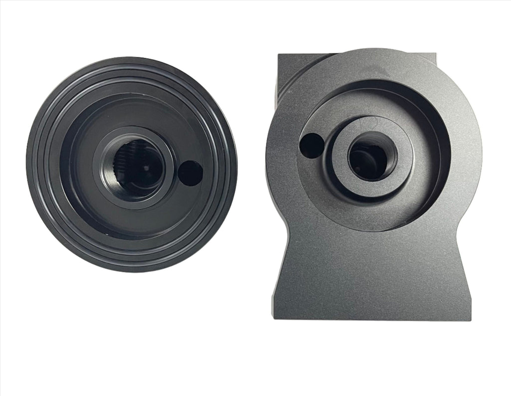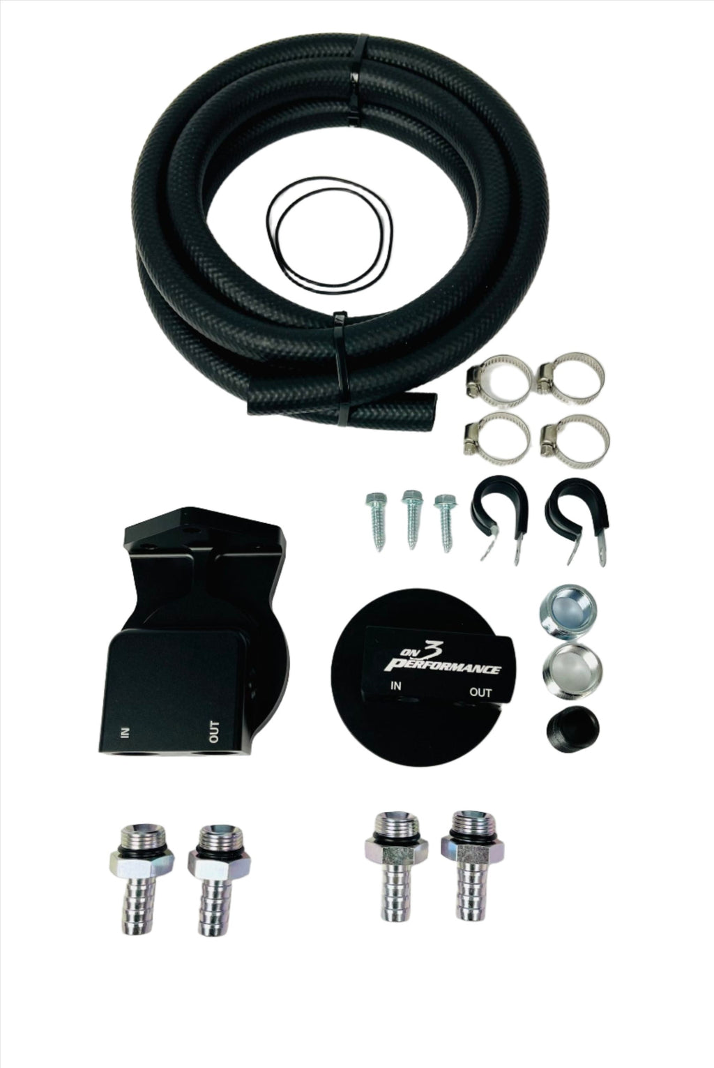 This is the On 3 Performance oil filter relocation kit used commonly in our Fox Body turbo systems all the way up through the 2010 3v cars. On the earlier push rod applications, our headers come down and intrude into the filter area. So instead of running an improperly sized filter, this will relocate it out of the way, keep it away from heat and make for easier access to it when its time for an oil change. Our oil relocation kit isn't reserved just for the turbo cars, its really beneficial for anyone swapping a 5.0 engine or wanting to possibly even tie in an external oil cooler.