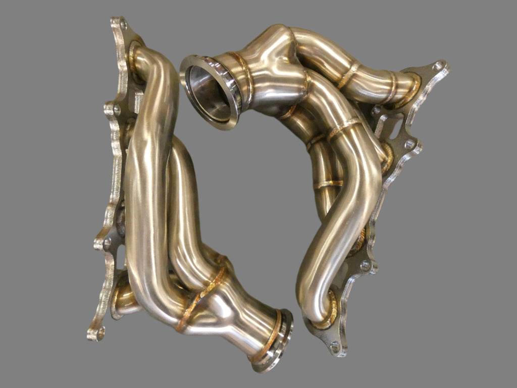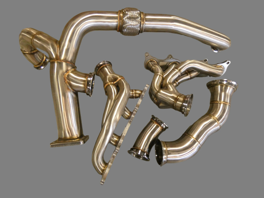 After purchasing our shop car as a roller, I decided to pick up a 2nd Gen F-150 Coyote engine and get started with our swap. Since these swaps are coming down in price and people are making crazy power, we decided to offer our kit we developed as a production system. As you can see below, the car makes excellent power and the fit/finish is exactly what you are looking for. Headers are constructed from 304ss thick wall tubing. We designed these to fit around the UPR/Team Z k-members as a heads-up. Exiting the headers, we have a 2.5" 304ss merge pipe up to the turbo which is setup with a T-4 4-bolt flange. The downpipe is a 3.0" exit from the turbo stepped to a 4" downpipe