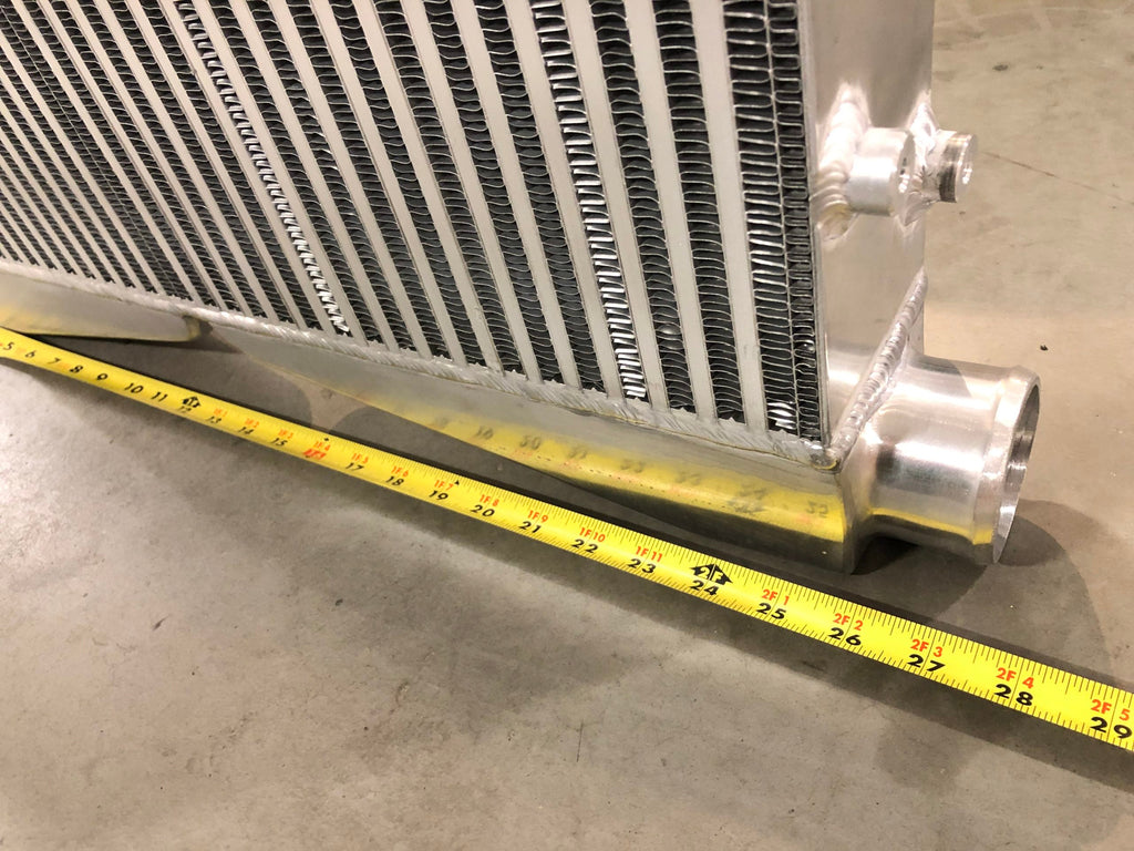 The core is 24" wide and 3.5" thick. From inlet to opposite side inlet at the bottom ~27.5". Measurement overall from lowest point to the top of the outlet ~17" We have the measurements in the photos showing a tape measure if you need to check for fitment