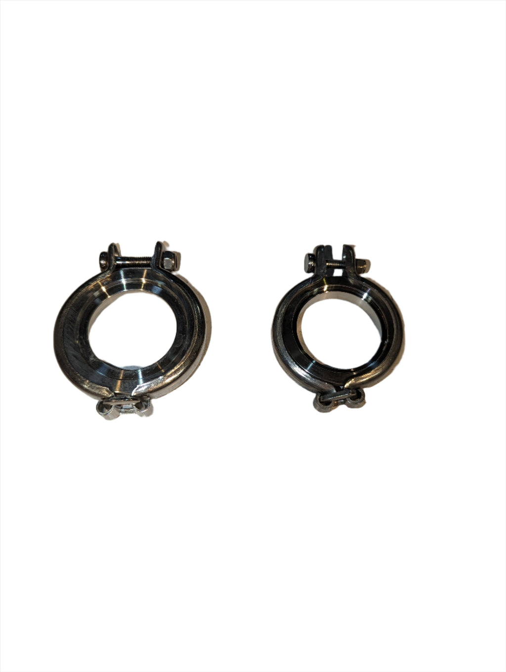 This is the 44mm wastegate flange and clamp set. This fits both the standard 44mm and the compact 44mm wastegates we offer. These are stainless flanges, designed to accept 1 7/8" tubing on the inlet side and 1 3/4" on the outlet side. The clamps are stainless as well as the fasteners.